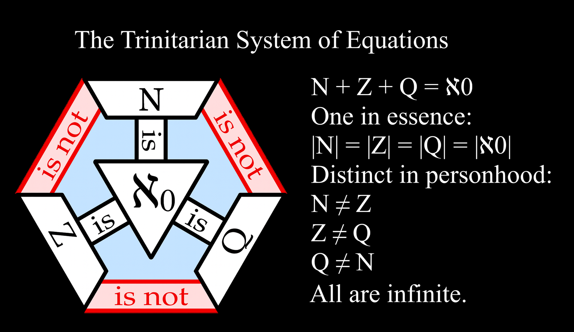 These two equations describe a single infinite set of numbers that are technically three distinct and overlapping infinite sets of numbers; where three are one and all are infinite. This is not Partialism because ℵ0 is a singular infinite set, and N, Z, and Q are all already infinite, none of them are a fraction of infinity. It isn't 1 + 1 + 1 = 3, it's ∞ + ∞ + ∞ = ∞. It is not Modalism, because none of these sets are modes of the others. It is not Arianism because this system of equations doesn't describe any process of emission. This equation agrees with the traditional Trinitarian understanding of a singular God consisting of three different Godheads. A singular infinite set of numbers that is three distinct infinite sets of numbers, sharing numbers between each other without being equivalent in meaning or role.